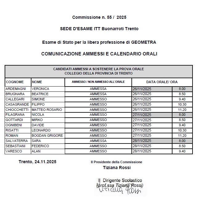 Si pubblicano gli esiti degli scritti e calendario dei colloqui orali per gli esami di Stato di abilitazione all'esercizio della libera professione di Geometra e Geometra Laureato Sessione 2025